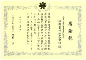 | 2025/10/01:北海道空知総合局札幌建設管理部より感謝状をいただきました |